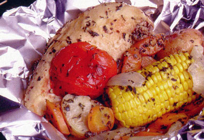 On a large piece of foil, place 1 split chicken breast half along with 1/2 piece of corn, 1/2 of a tomato, 1/4 of an onion, several pieces of carrots, 2 halves of red potato, 1 tablespoon of butter, several dashes of your favorite herbs and salt and pepper to taste. Fold aluminum foil around ingredients so that no liquids can leak out.