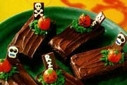 Press 1 chocolate piece into end of each brownie for tombstone.