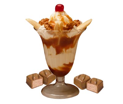 Add two scoops ice cream, add more melted candy bar, a squeeze of caramel topping and cover with whipping cream.