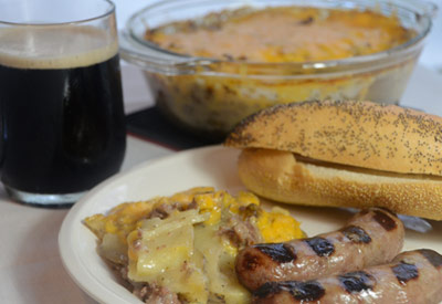 Spray a 2- quart casserole with nonstick cooking spray. Place half the potatoes in bottom of dish. Top with half the soup mixture and half the cooked sausage. Repeat layers, ending with sausage; dot with butter.