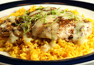 Place chicken breasts over hot rice and drizzle with chile cream sauce. Sprinkle with lime zest. Serve with additional sauce.