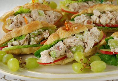 Line inside of croissant with lettuce. Lay two slices of apple over lettuce (skin side facing out). Spoon equal amounts of chicken salad into each croissant. Secure with frilled toothpicks.