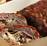 On top of the meat mixture, place ham slices, cheese slices, and remaining pepper and onion. Roll entire meatloaf like you would a jelly roll, making sure all seams and ends are sealed. Place into a 9" x 13" pan and spread ketchup over the top of the meatloaf.