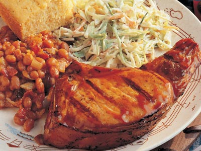 Place pork chops over direct heat above medium-hot coals. Grill chops for about 4-5 minutes, until nicely browned on one side; turn and brush liberally with sauce. Grill for 4-5 minutes more; turn and brush with more sauce. Grill for a few minutes more, turning and brushing with sauce. Discard any leftover sauce. Serve chops immediately.