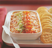 3. Top with bell peppers, onions and cayenne pepper. Serve with crackers.