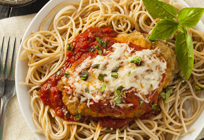 Place each piece of chicken over a bed of spaghetti and sprinkle with ribbons of fresh basil and serve with the extra pasta sauce.