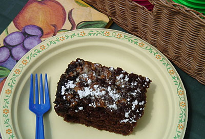 The powdered sugar is absorbed by the cake after a few hours, so additional powdered sugar may need to be sprinkled on top of the cake before serving.