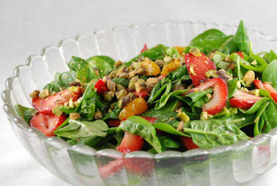 Gently toss spinach, strawberries, oranges and dressing. Top with pistachios; serve at once.