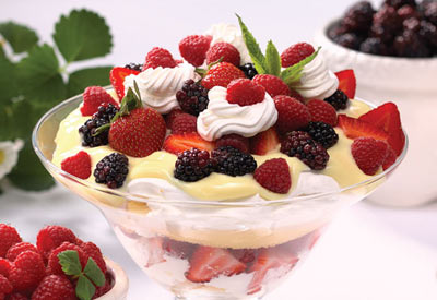 Place single layer of cake slices in bottom of serving bowl. Top with 1/3 of the pudding and 1/3 of the berries.