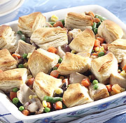 Stir in chicken and vegetables. Heat until hot and bubbling. Pour chicken mixture into 9-inch square pan. Place refrigerated biscuits on hot mixture and bake in 400 F. oven until biscuits are golden, approximately 15 minutes.