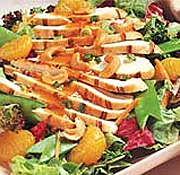 In a large bowl combine salad lettuces and oranges. Pour all put 2 Tbsp dressing over the salad and toss.