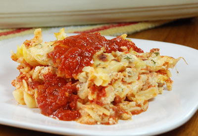 In a 13 x 9- inch baking dish add a thin layer of spaghetti sauce, half of the cooked quinoa, half of the cooked sausage, dollops of ricotta cheese, half of the spaghetti sauce and slices of mozzarella cheese. Repeat procedure ending with mozzarella cheese. Pour parmesan cheese over the top and sprinkle with parsley.